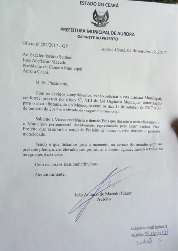 O prefeito de Aurora ainda enviou à Câmara um ofício, requerendo permissão para uma viagem internacional, entre os dias 14 e 31 de outubro. (foto ao final da matéria) Desta forma, assumirá interinamente o Governo Municipal, o vice Edigler Filho.